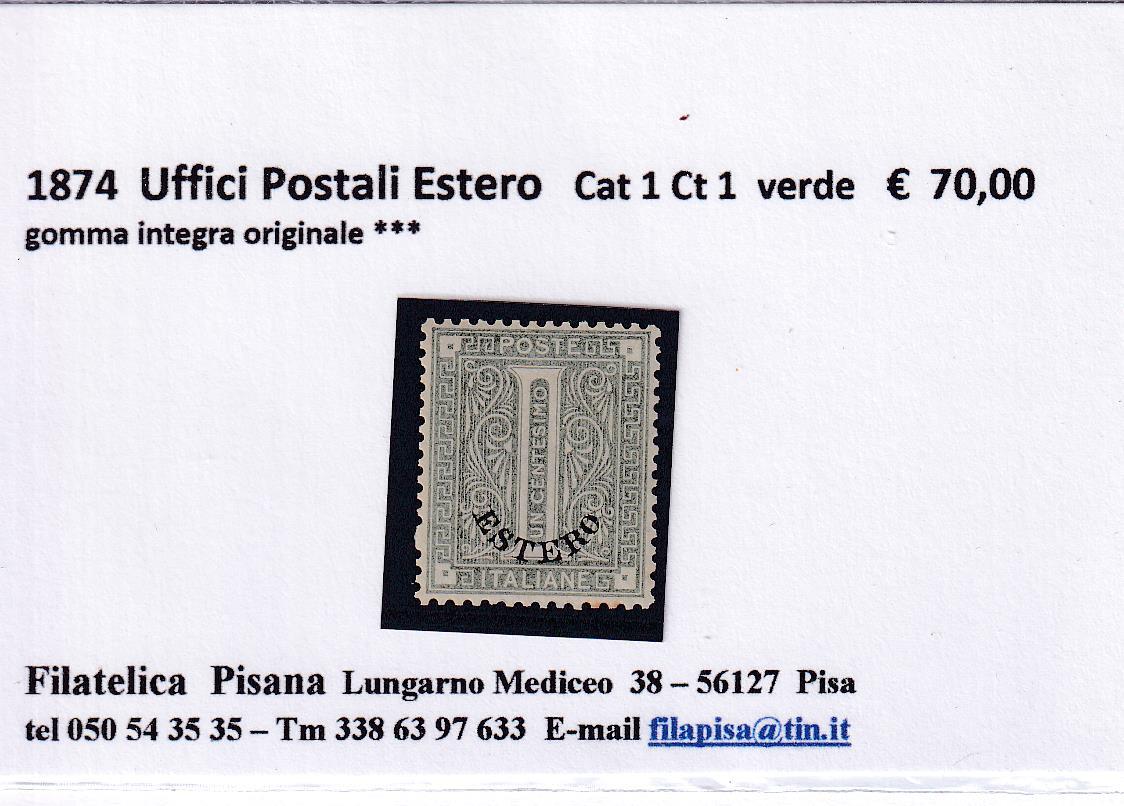 Francobollo Uffici Postali Estero Emissioni Generali Anno 1874 Serie Vittorio Emanuele II del1869 Soprastampati Estero Centesimi 1 verde oliva (cat. n. 1)