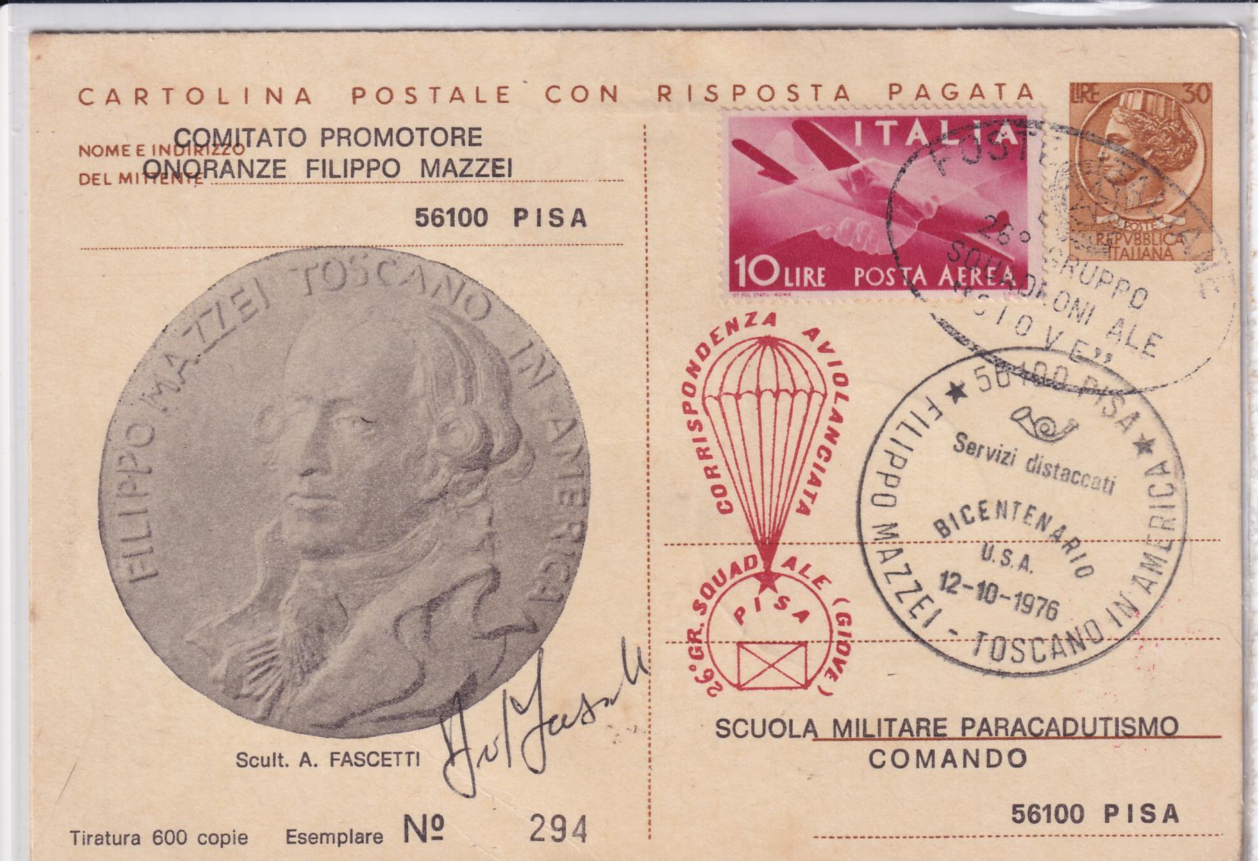 Intero postale n. 169 Lire 30+30 ‘Medaglia di Filippo Mazzei’ opera A. Fascetti (cartolina volata, viaggiata, ritorno) tiratura 600 pezzi – con firma dell’Autore
