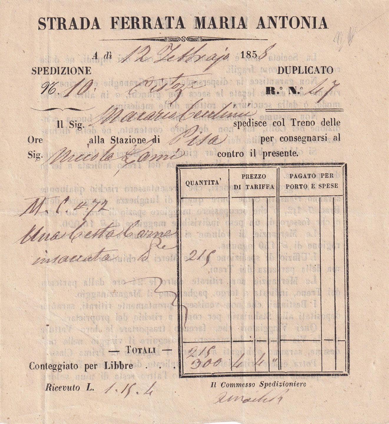 Lettera di viaggio Da Pistoia a Pisa 12 febbraio 1885