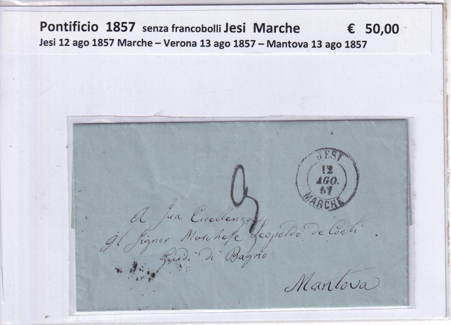 Lettera senza francobolli Stato Pontificio Anno 1857 da Jesi a Mantova