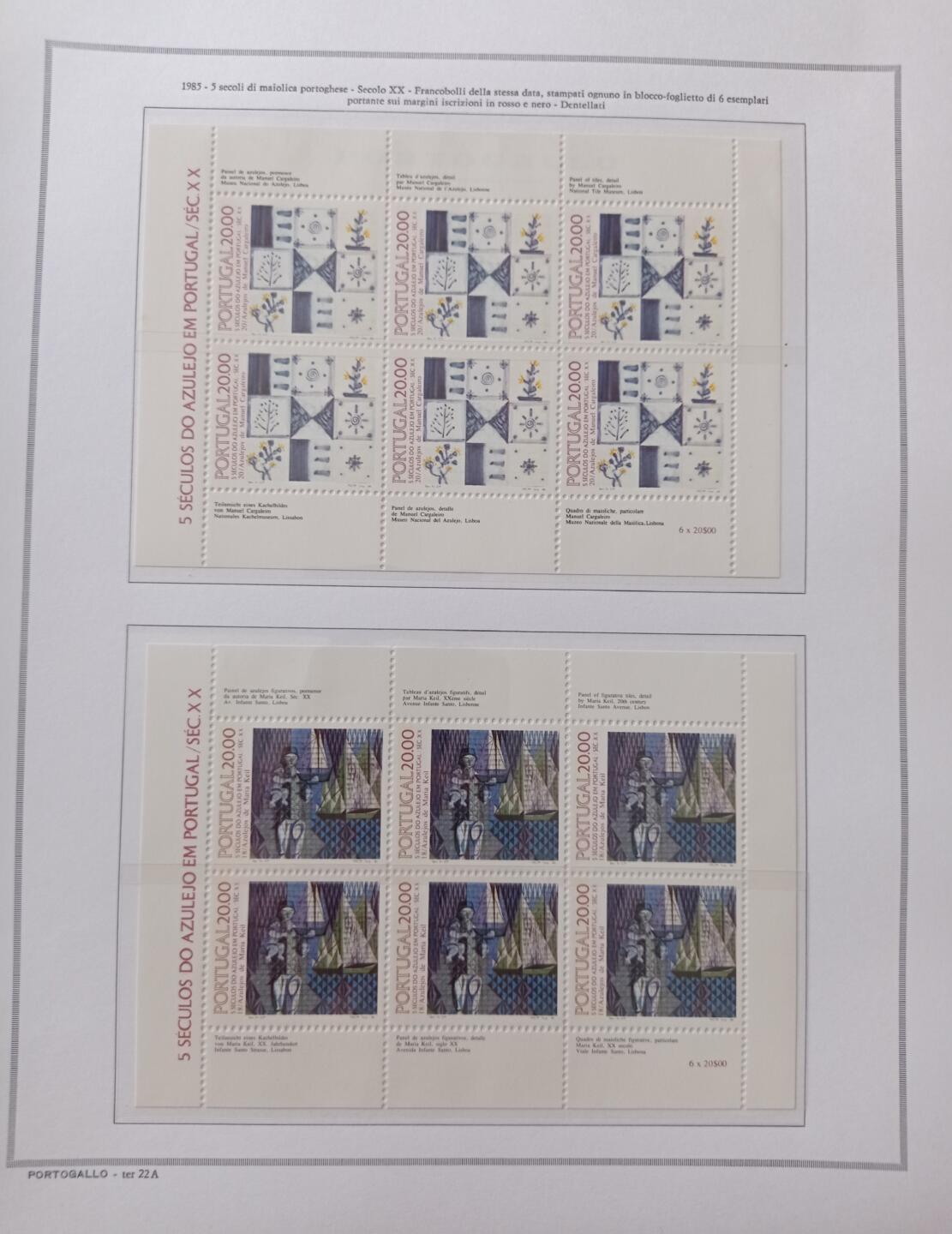 Minifogli Portogallo Anno 1985 Maioliche portoghesi 18esima e 20esima serie (cat. n. 1635 e 1651) montati su Fogli Marini King usati (i fogli sono in omaggio)