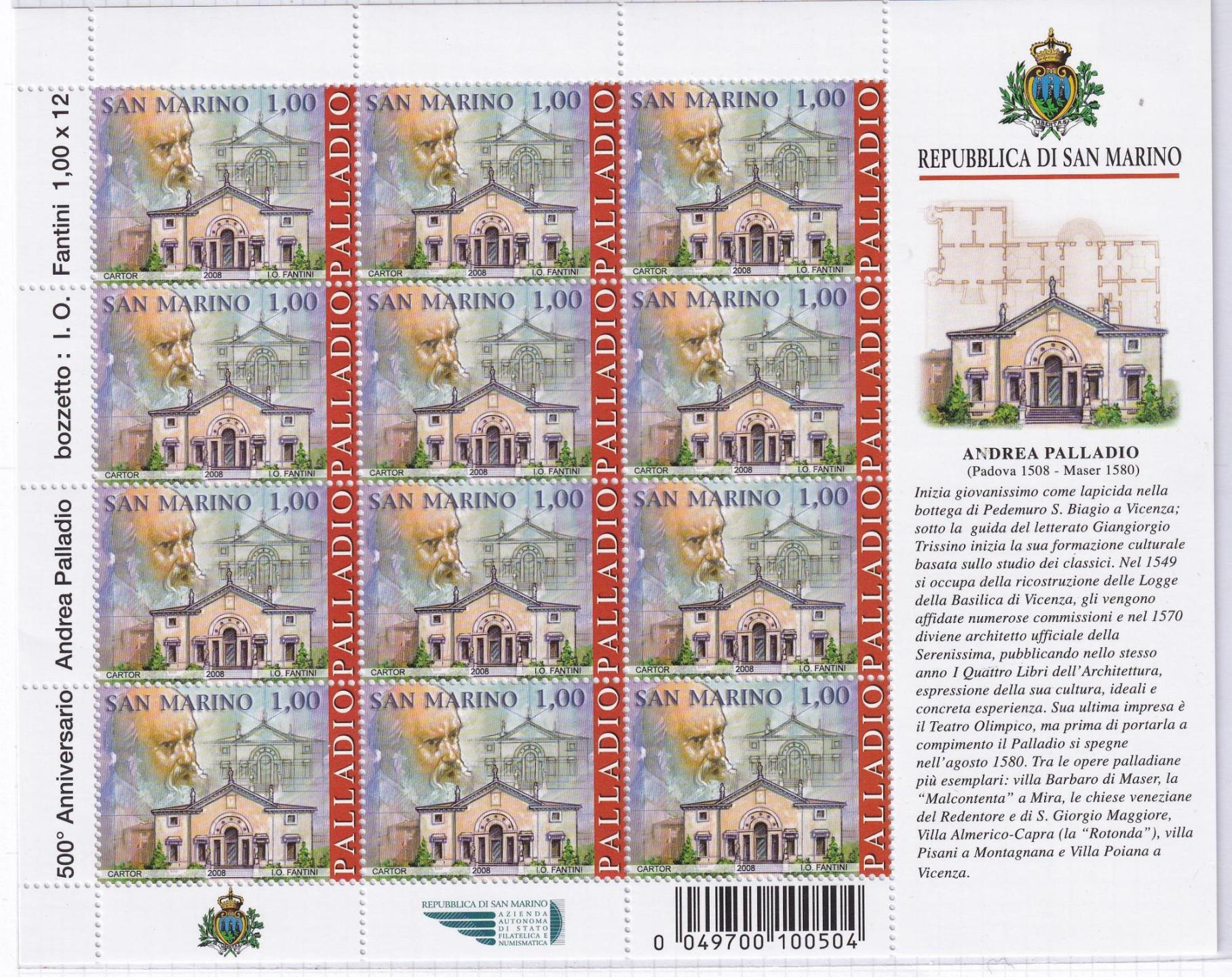 Minifoglio San Marino Anno 2008 Quinto centenario della nascita di Andrea Palladio (cat. n. 2197)