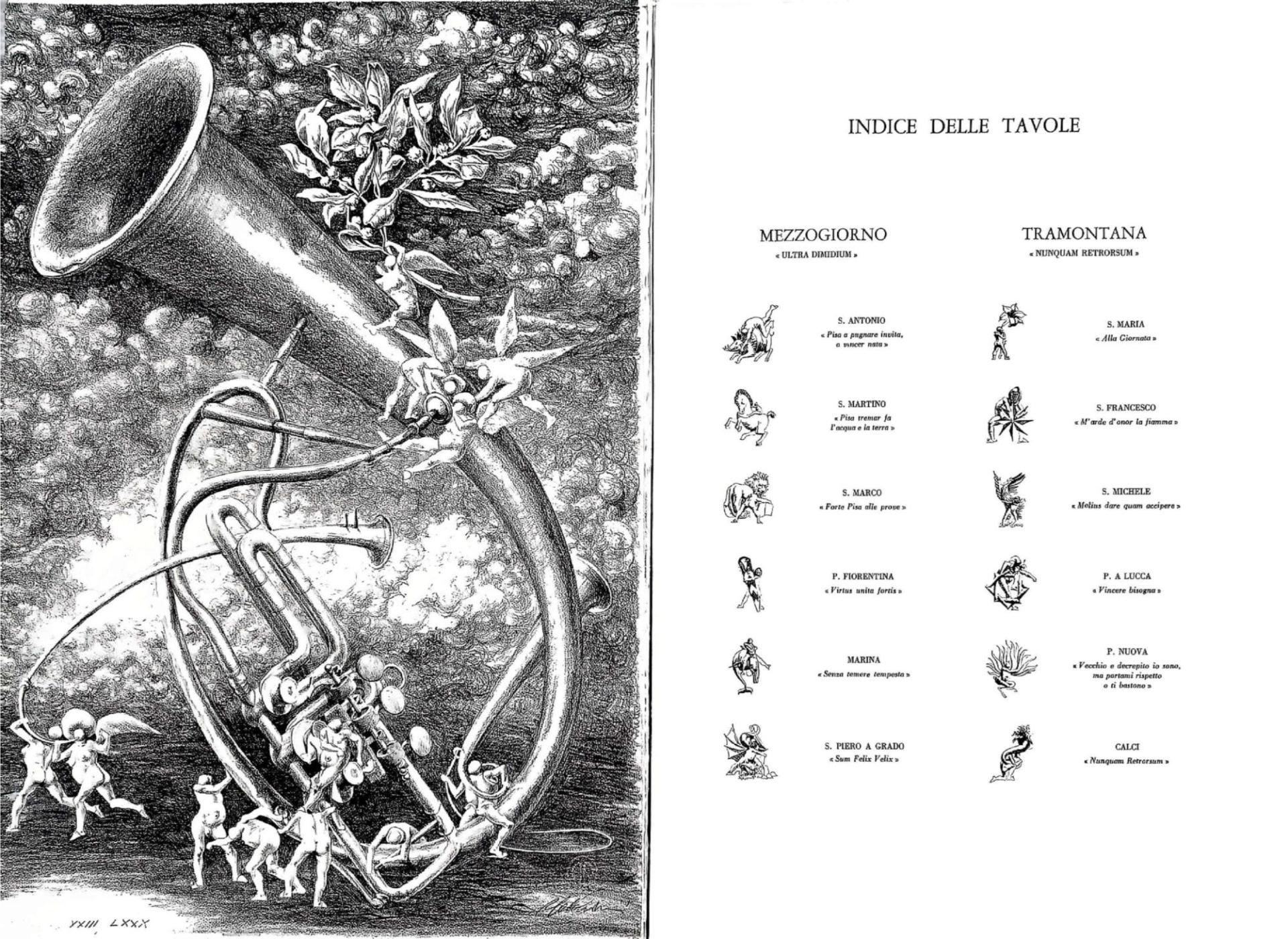 Le 12 litografie ripropongono le iconografie caratteristiche dei 12 Quartieri in cui è storicamente suddivisa Pisa e che annualmente si scontrano nello storico Gioco del Punte (evento storico che negli ultimi 40 anni ha la sua rievocazione annuale nell’ultimo fine settimana di giugno)