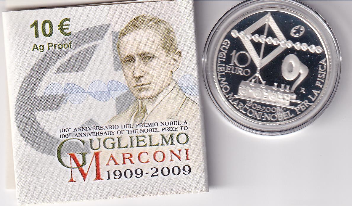 Moneta commemorativa Italia Repubblica Euro 10,00 Centesimo Anniversario Premio Nobel Guglielmo Marconi Anno 2009 Proof