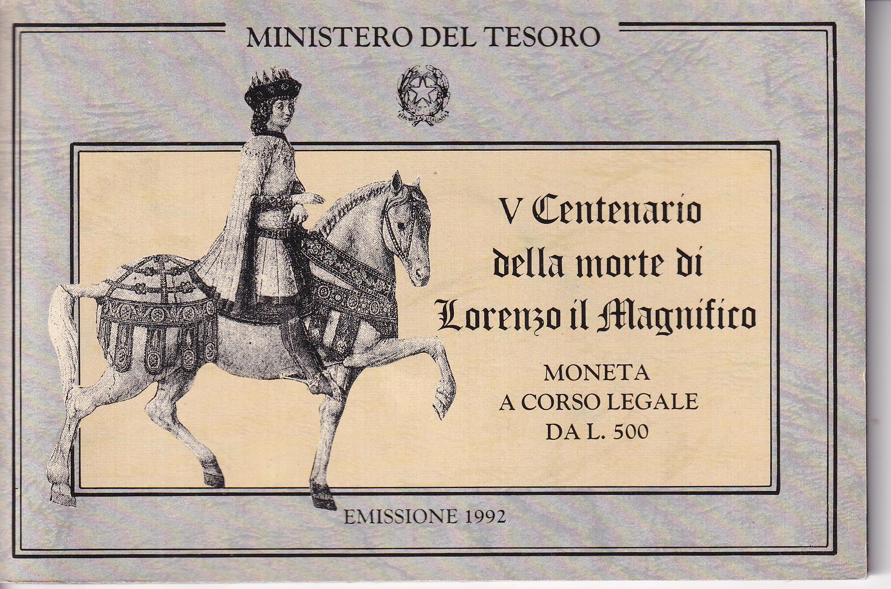 Moneta da Lire 500 in argento commemorativa del V Centenario della morte di Lorenzo Il Magnifico