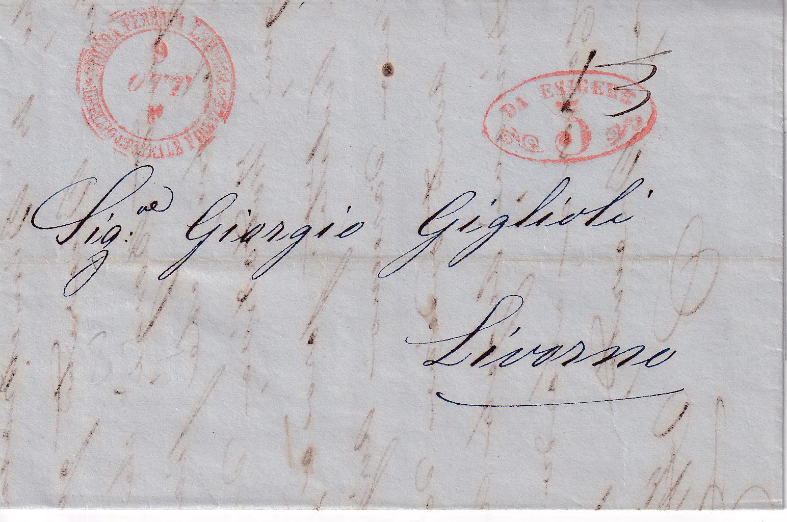 Prefilatelica. Strada Ferrata Leopolda da Firenze 9 OTT M (1857) a Livorno. Contiene lo scritto