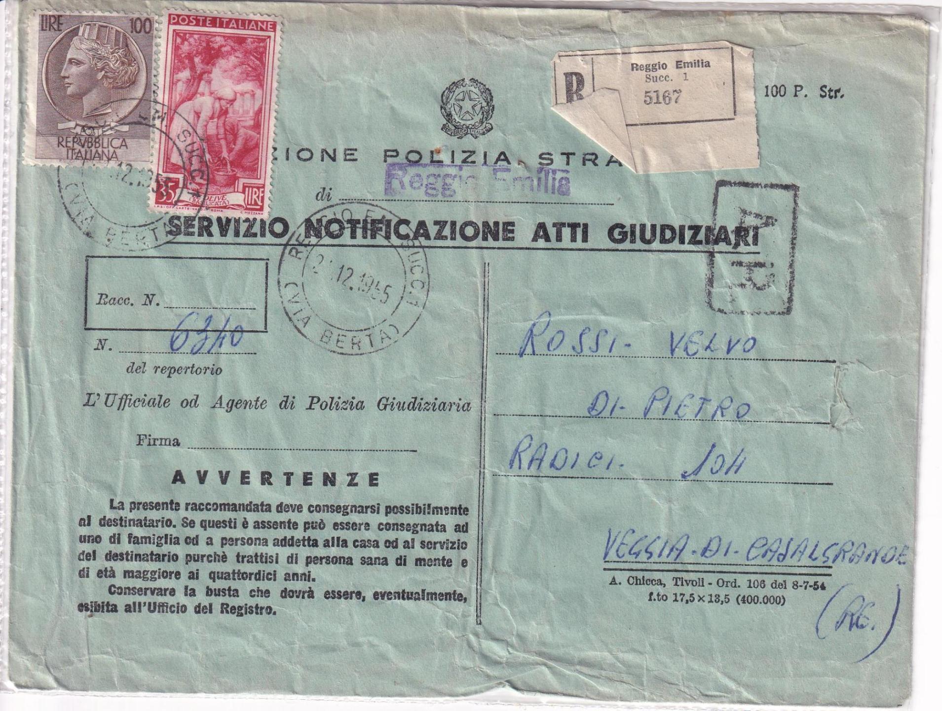 Raccomandata da Reggio Emilia R 5167 21/12/1955 Veggia di Casalgrande