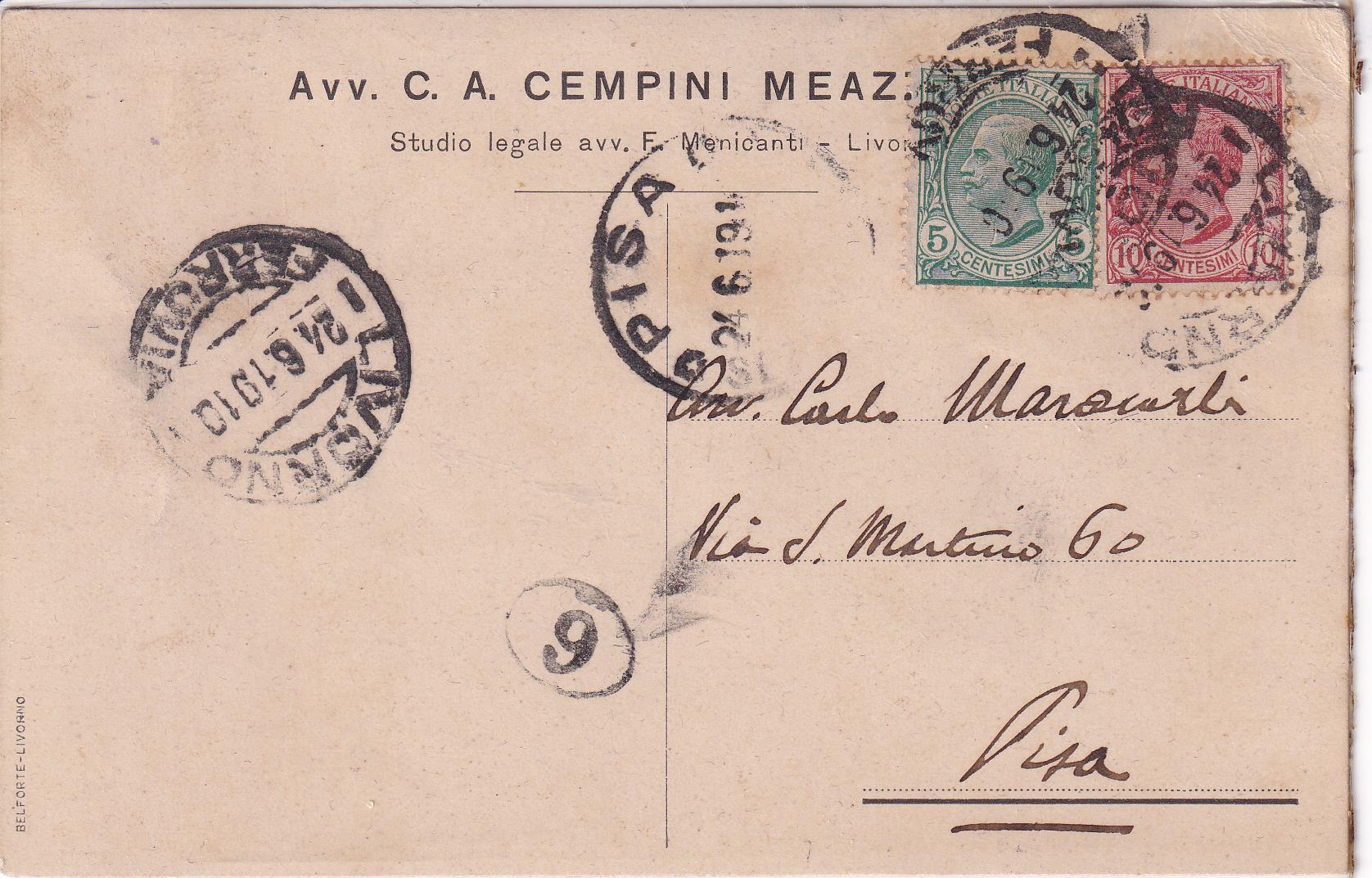 Cartolina da Livorno 24/06/1910 a Pisa