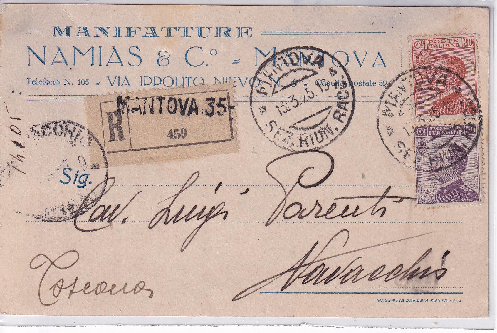 Cartolina Raccomandata da Mantova 35 n 459 del 13/03/1925 a Navacchio