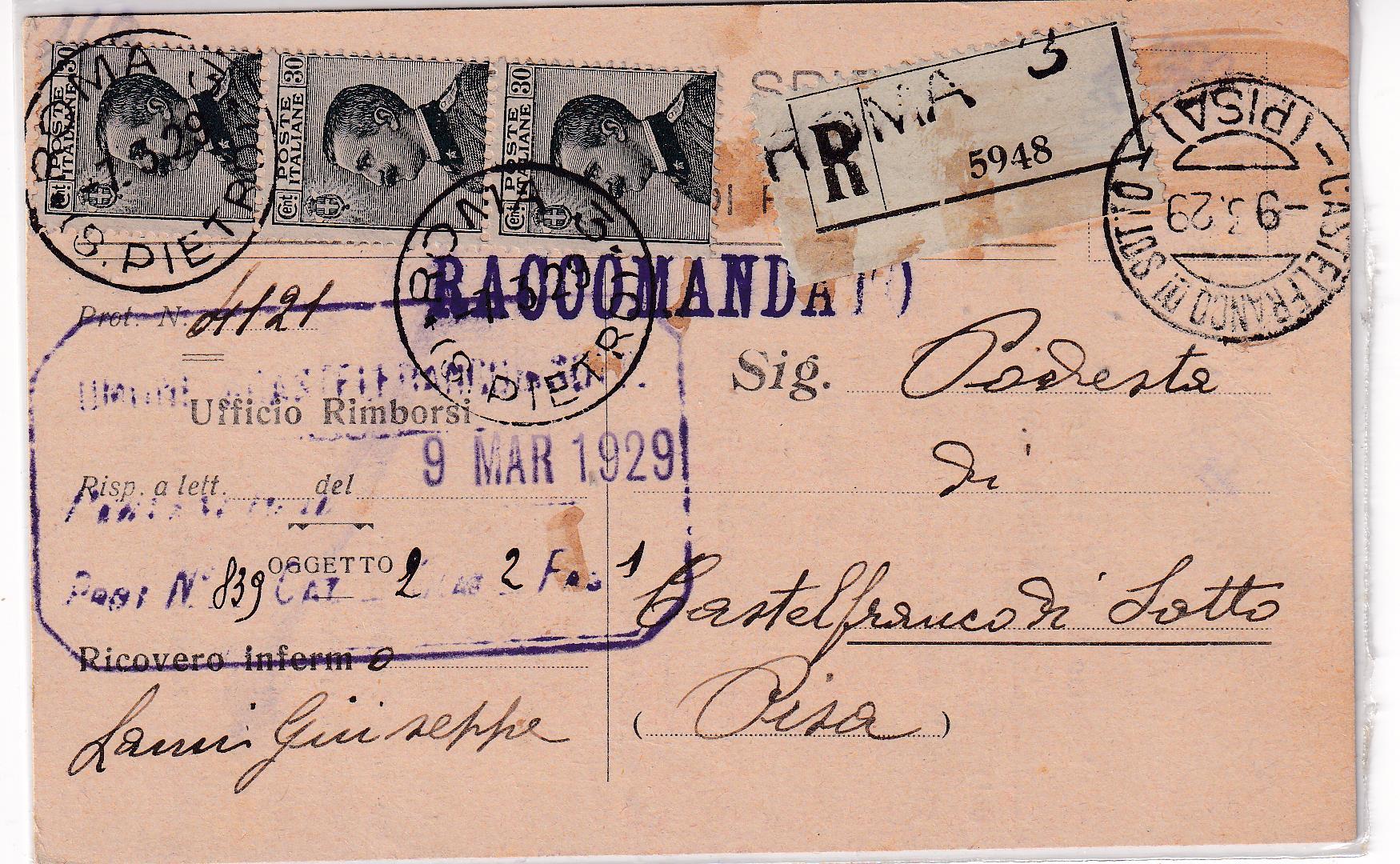 da Roma 5948 del 07/03/1929 a Castelfranco di Sotto 09/03/1929