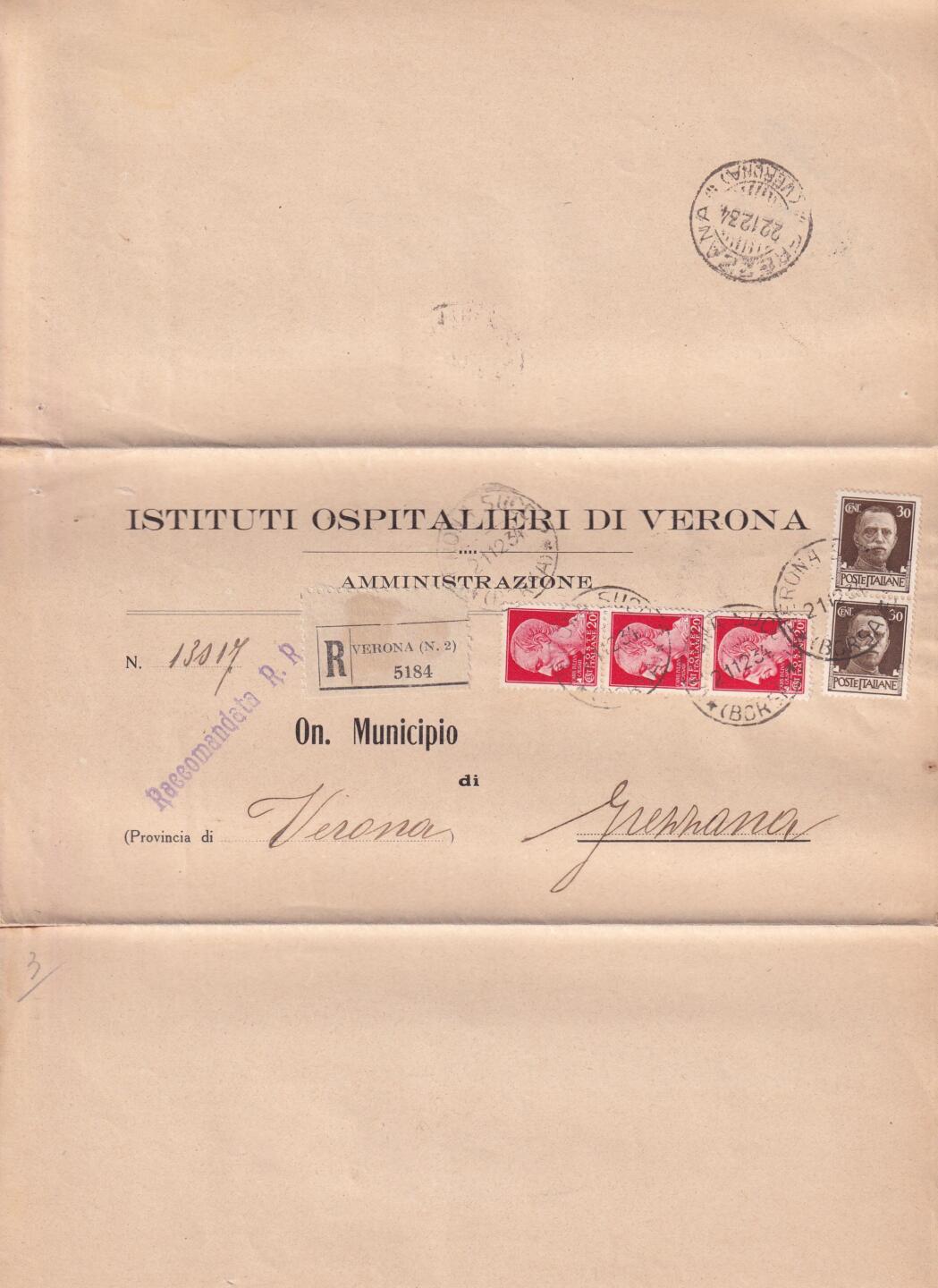 Circolare da Amministrazione Istituti Ospitalieri di Verona R Verona n. 2 5184 del 21/12/1934 al Municipio di Grezzana (Verona)