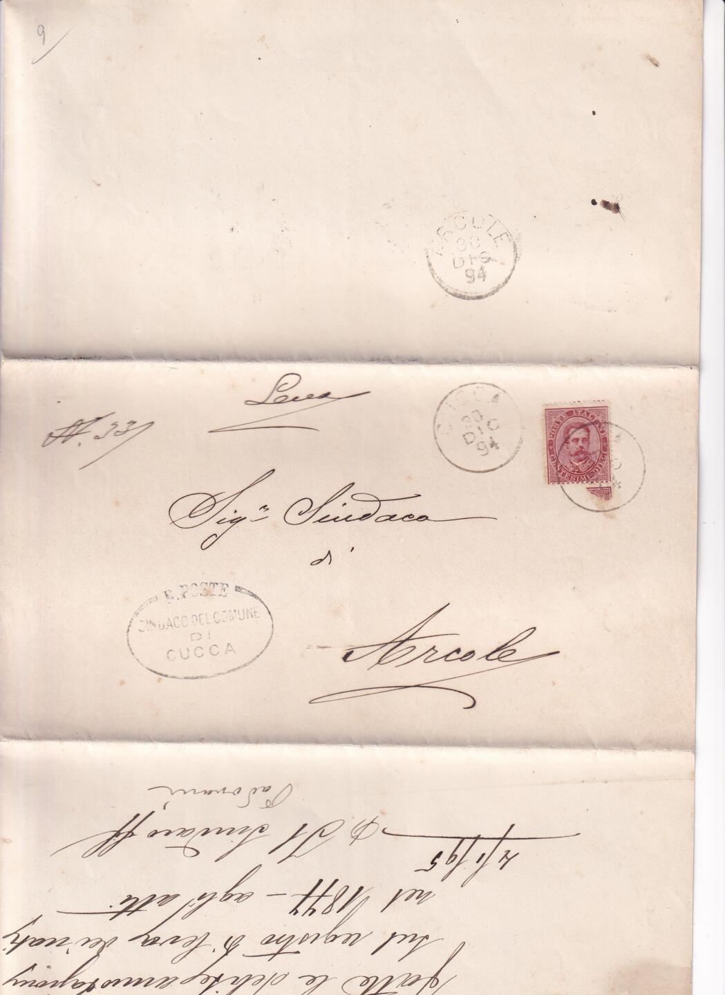 Circolare da Municipio Cucca (Timbro R. Poste Sindaco del Comune di Cucca) 30/12/1894 al Sig. Sindaco di Arcore