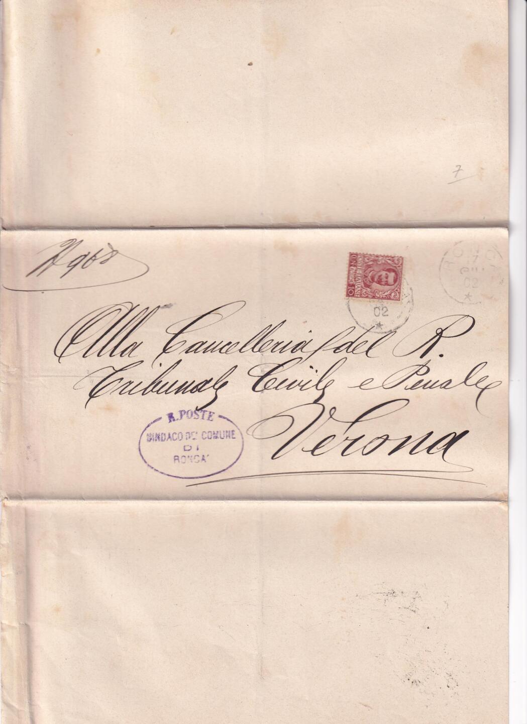 Circolare da Municipio Roncà (Timbro: R. Poste Sindaco del Comune di Roncà) 17/06/1902 alla Cancelleria del Tribunale Civile e Penale di Verona