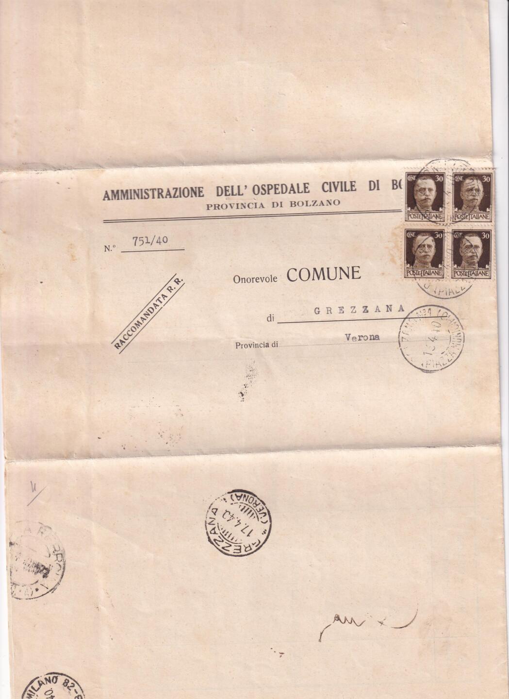 Circolare da Ospedale Bolzano 15/04/1940 a Comune di Grezzana (Verona)