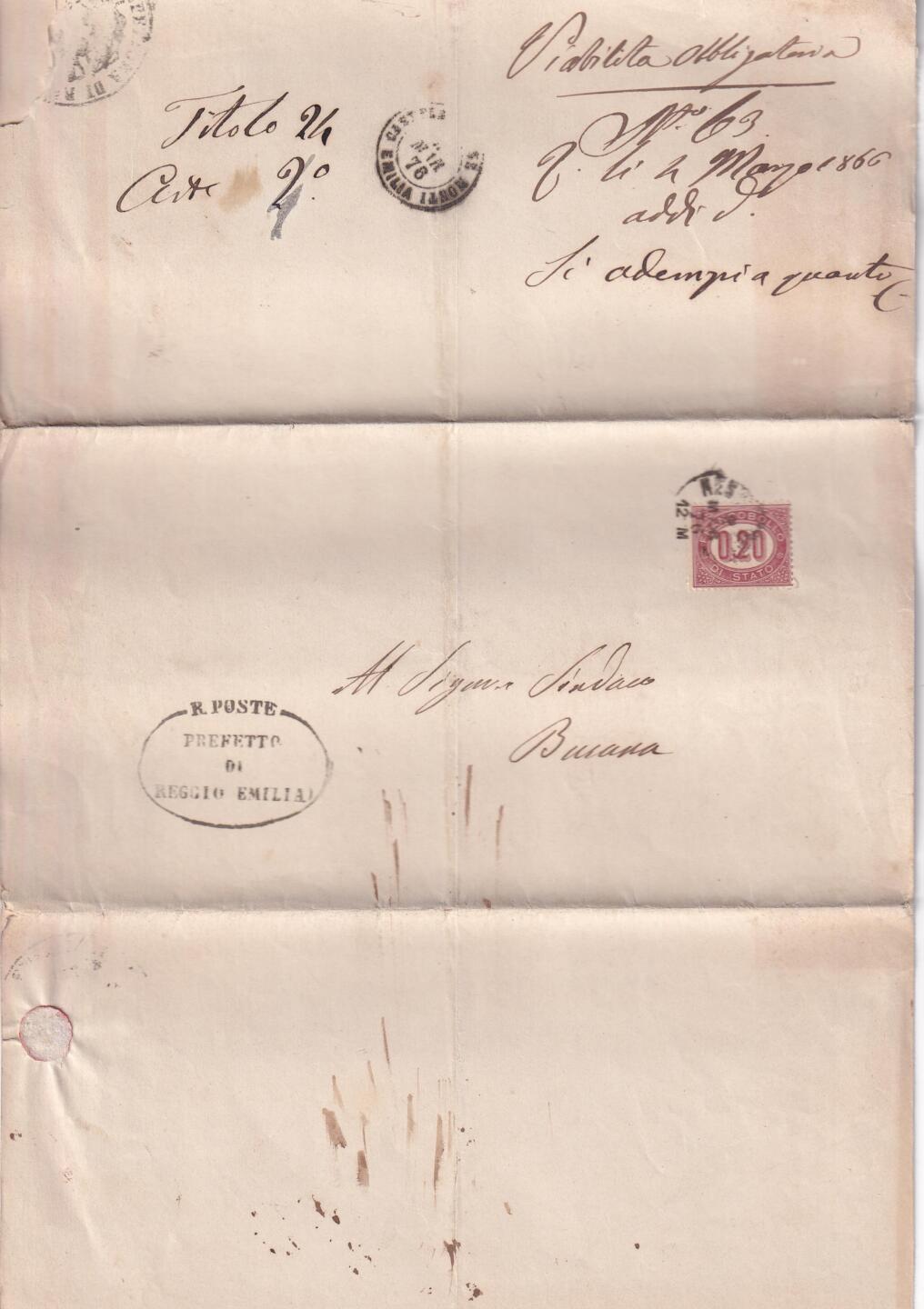 Circolare da Prefettura Reggio Emilia 29/02/1876 al Sindaco di Busana –/03/1876