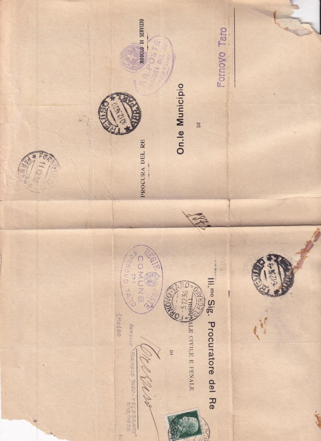 Circolare dal Municipio di Fornovo Taro alla Procura del Re presso il Tribunale Civile e Penale di Treviso 05/12/1936 Rispedita al Municipio di Fornovo Taro il 10/12/1936 e arrivata 11/12/1936