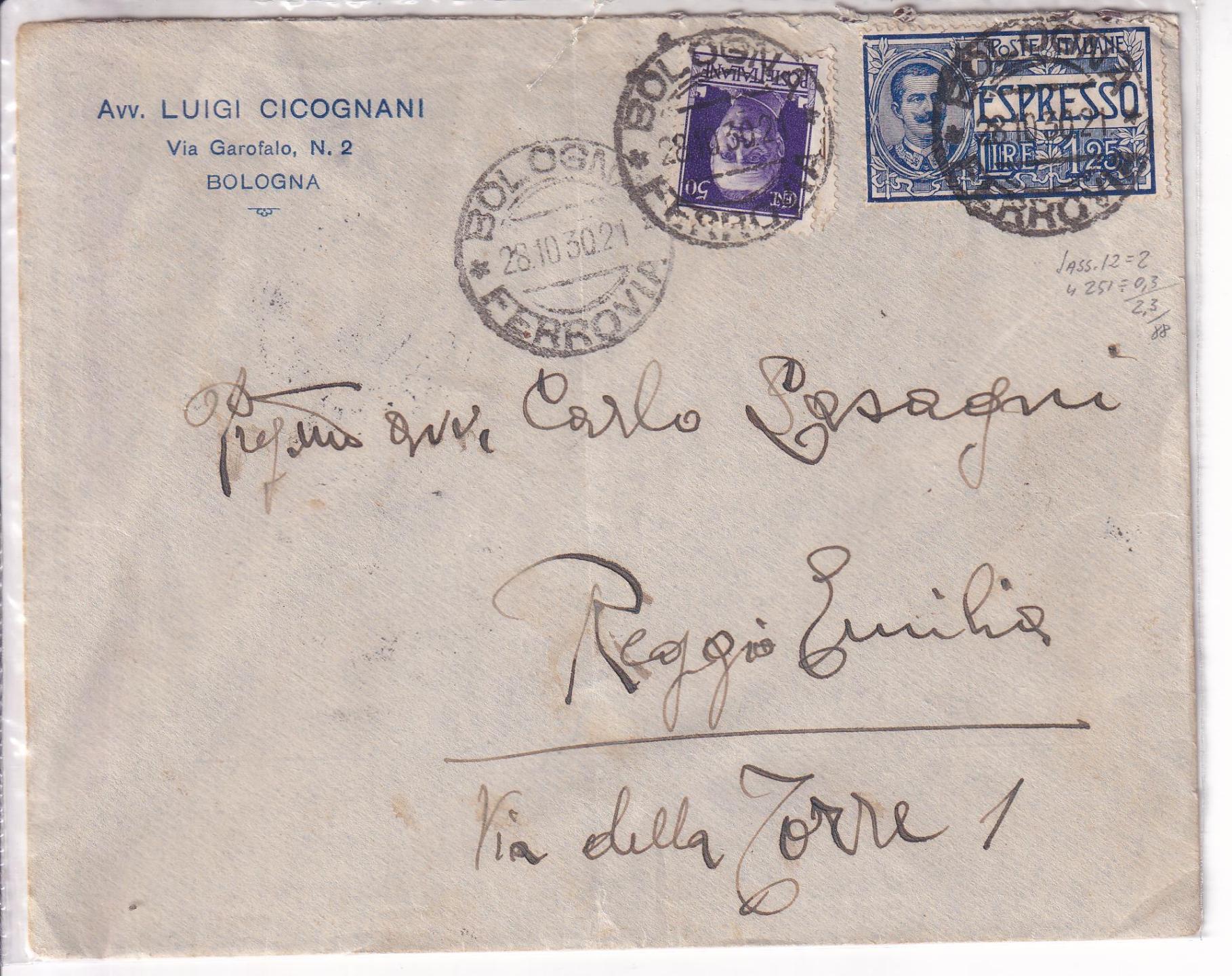 Storia postale. Espresso da Bologna 28/10/1930 a Reggio Emilia 28/03/1930