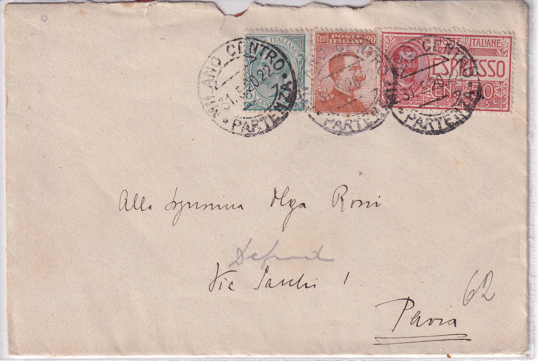 Storia postale. Espresso da Milano 31/05/1920 a Pavia 31/05/1920