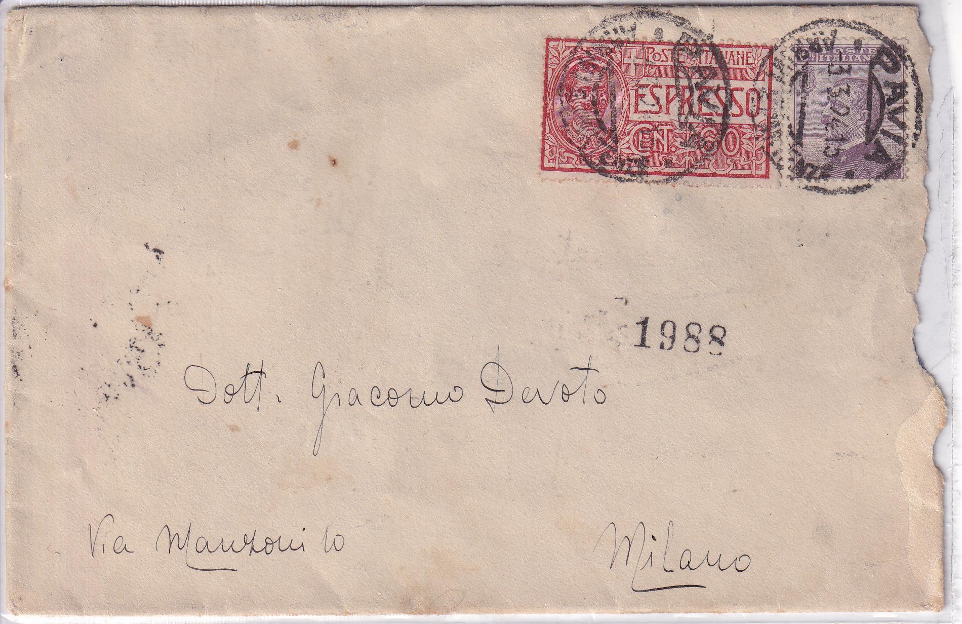 Storia postale. Espresso da Pavia 1988 03/03/1924 a Milano 3/03/1924