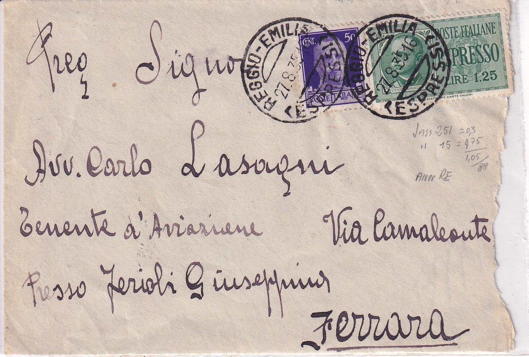 Storia postale. Espresso da Reggio Emilia 27/08/1935 a Ferrara 28/08/1935