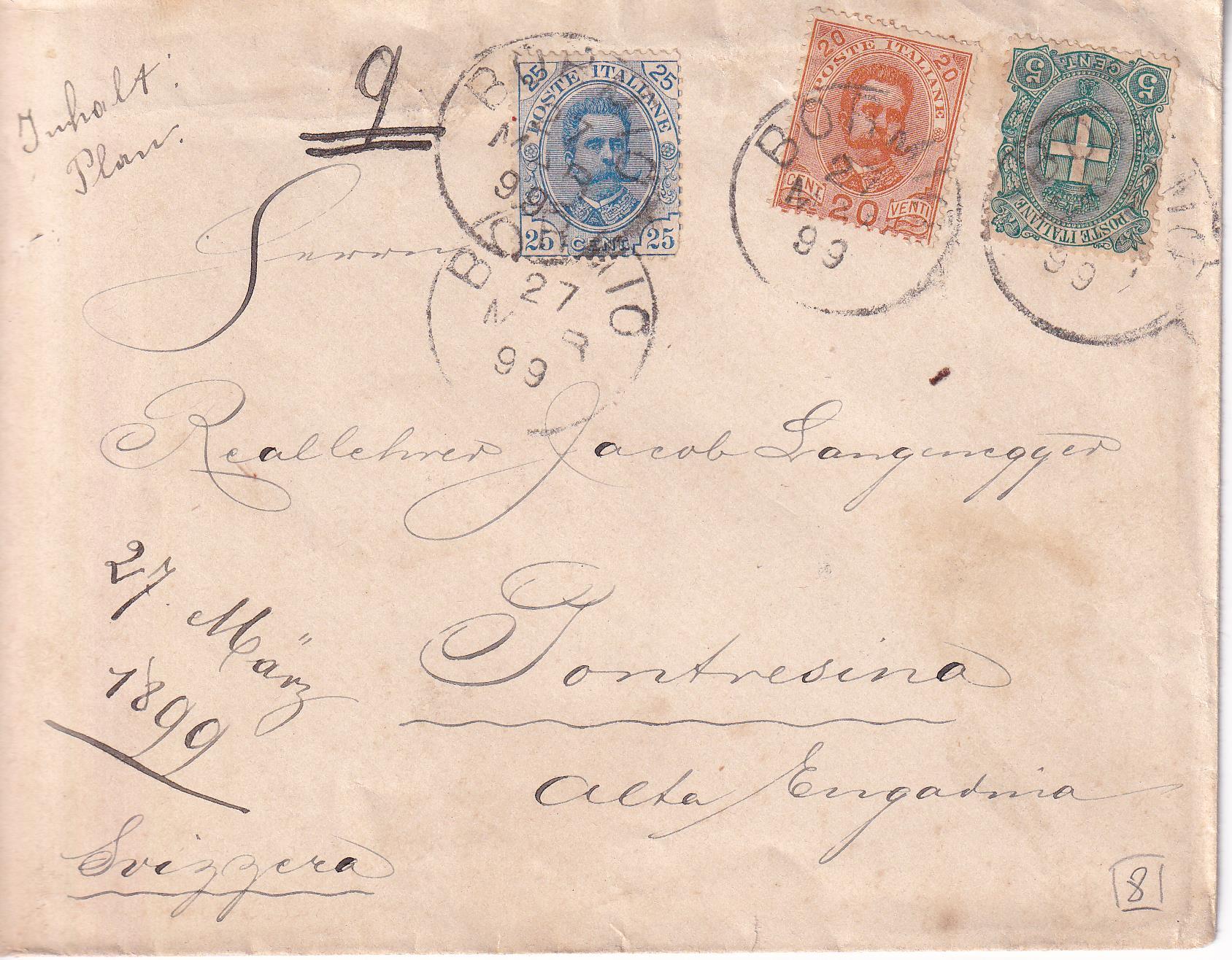 Lettera Bormio 27/03/1899 a Pontresina (Svizzera) 28/07!899