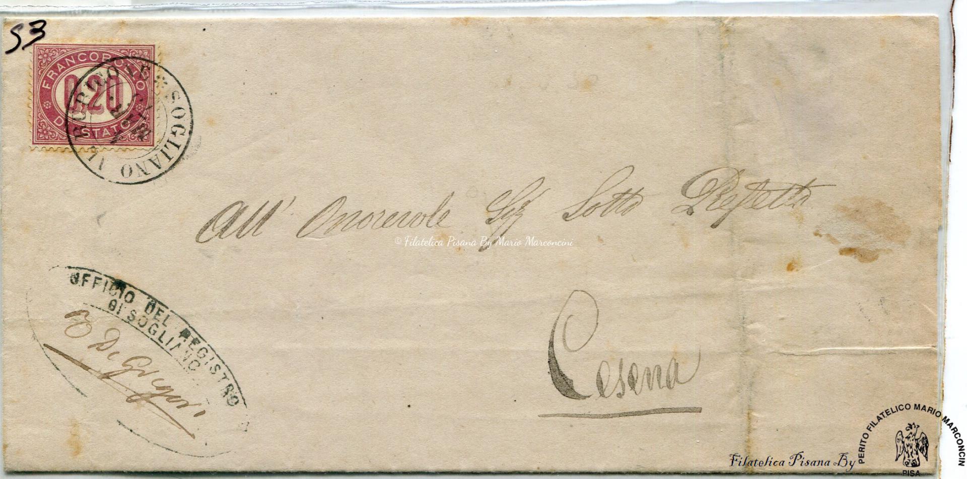Storia postale. Lettera di Servizio da Sogliano sul Rubicone 04/03/1873 a Cesena