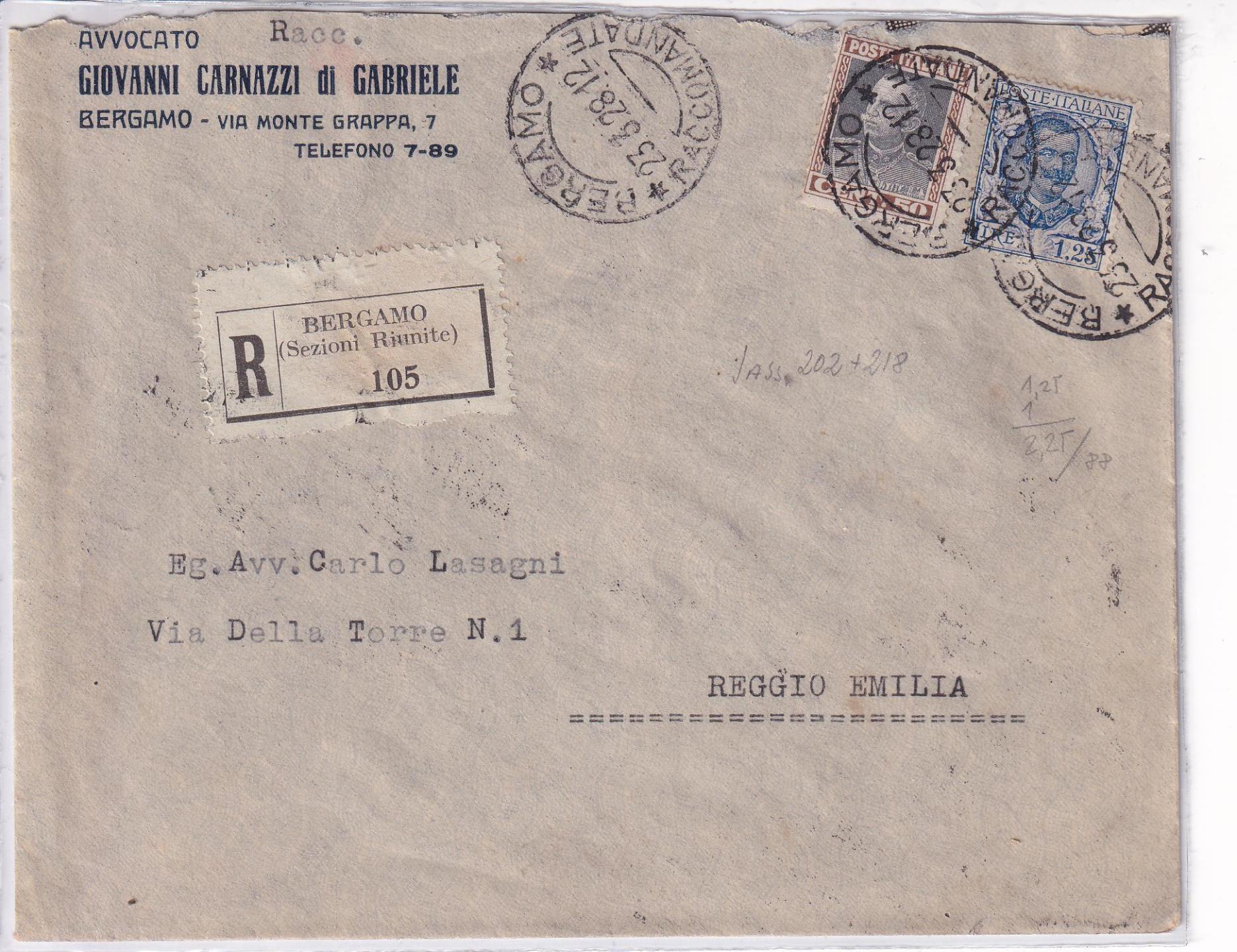 Raccomandata da Bergamo R 105 del 23/03/1928 a Reggio Emilia 23/03/1928