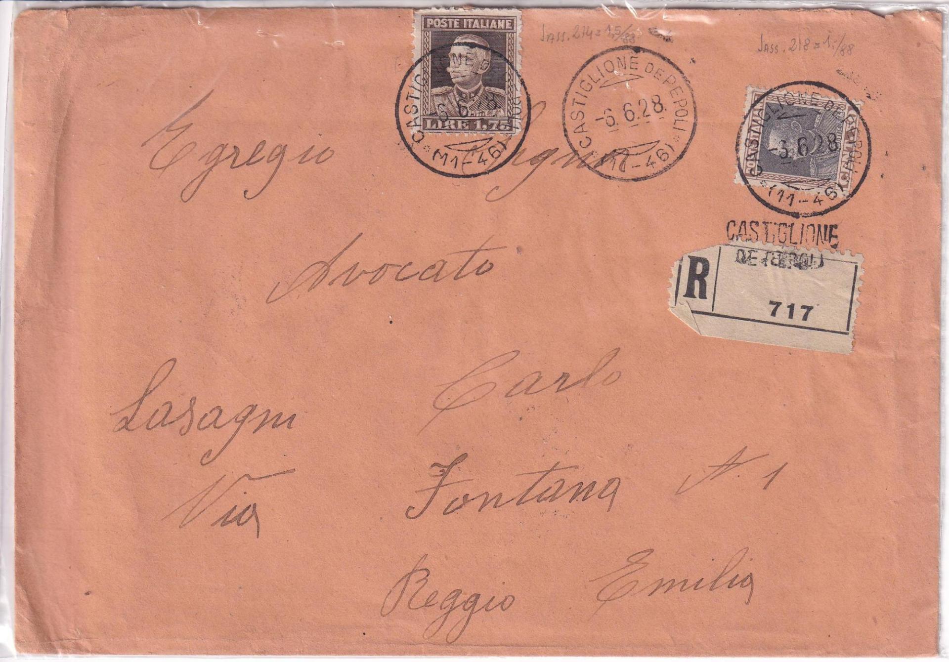 Raccomandata da Castiglioni de Pepoli R 717 del 06/06/1928 a Reggio Emilia 07/06/1928