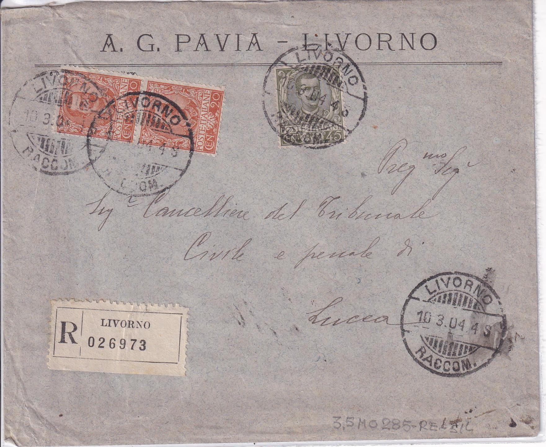 Raccomandata da Livorno R 26973 del 10/03/1904 a Lucca 08/11/1924