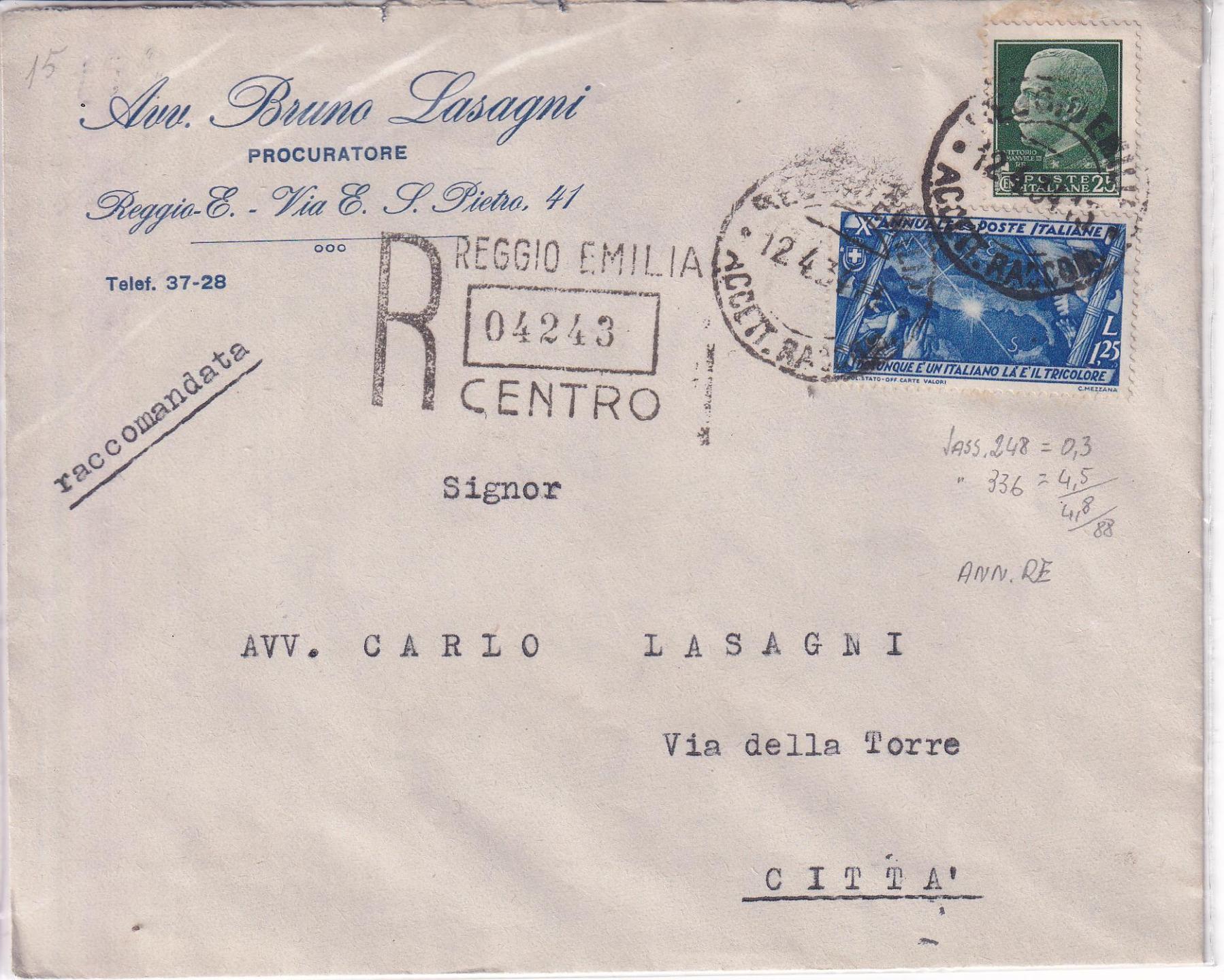 Raccomandata da Reggio Emilia R 4243 del 12/04/1934 a Reggio Emilia 12/04/1934