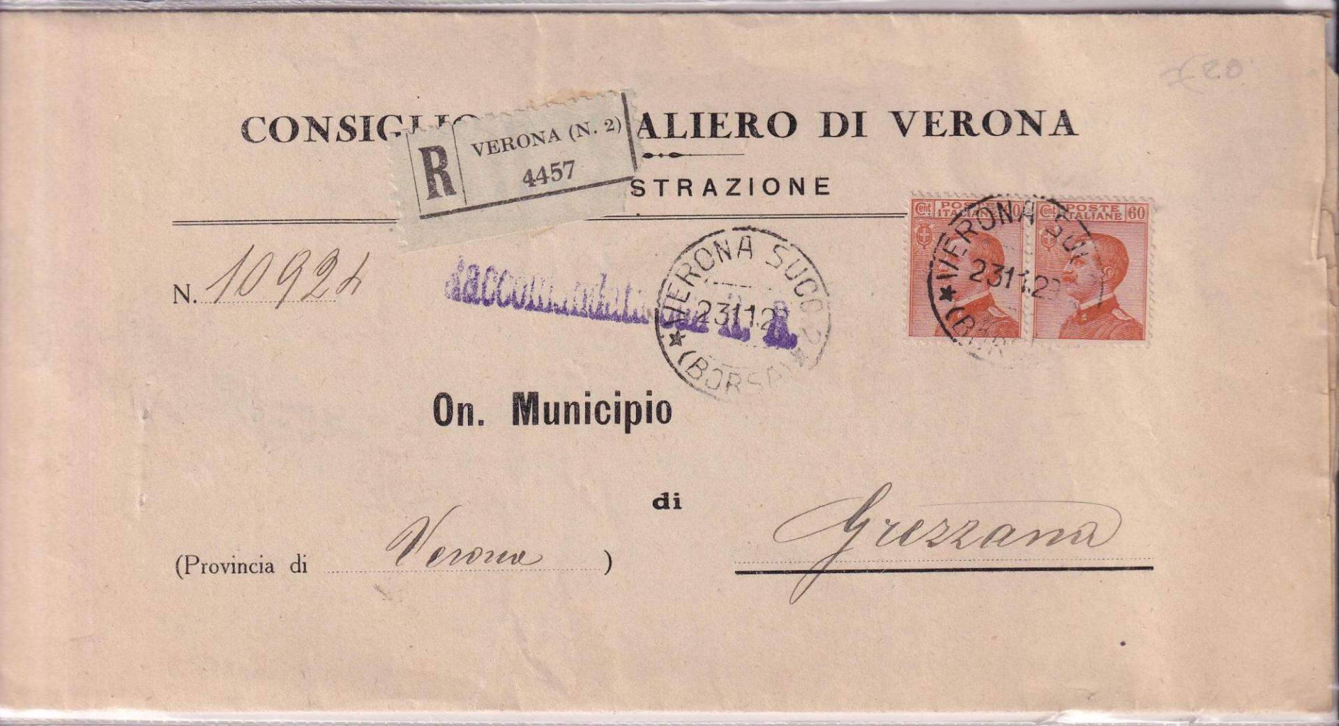 Raccomandata da Verona 2 4457 del 23/11/1929 a Grezzana
