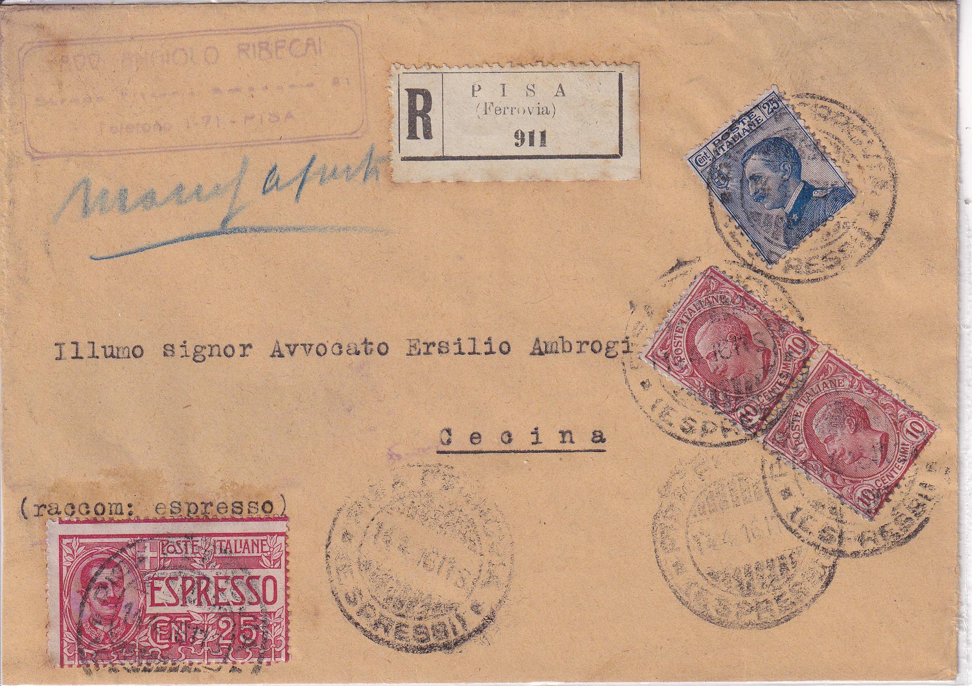 Raccomandata Espresso da Pisa ferrovia R 911 del 28/12/1925 a Cecina (Pisa) 15/04/1916