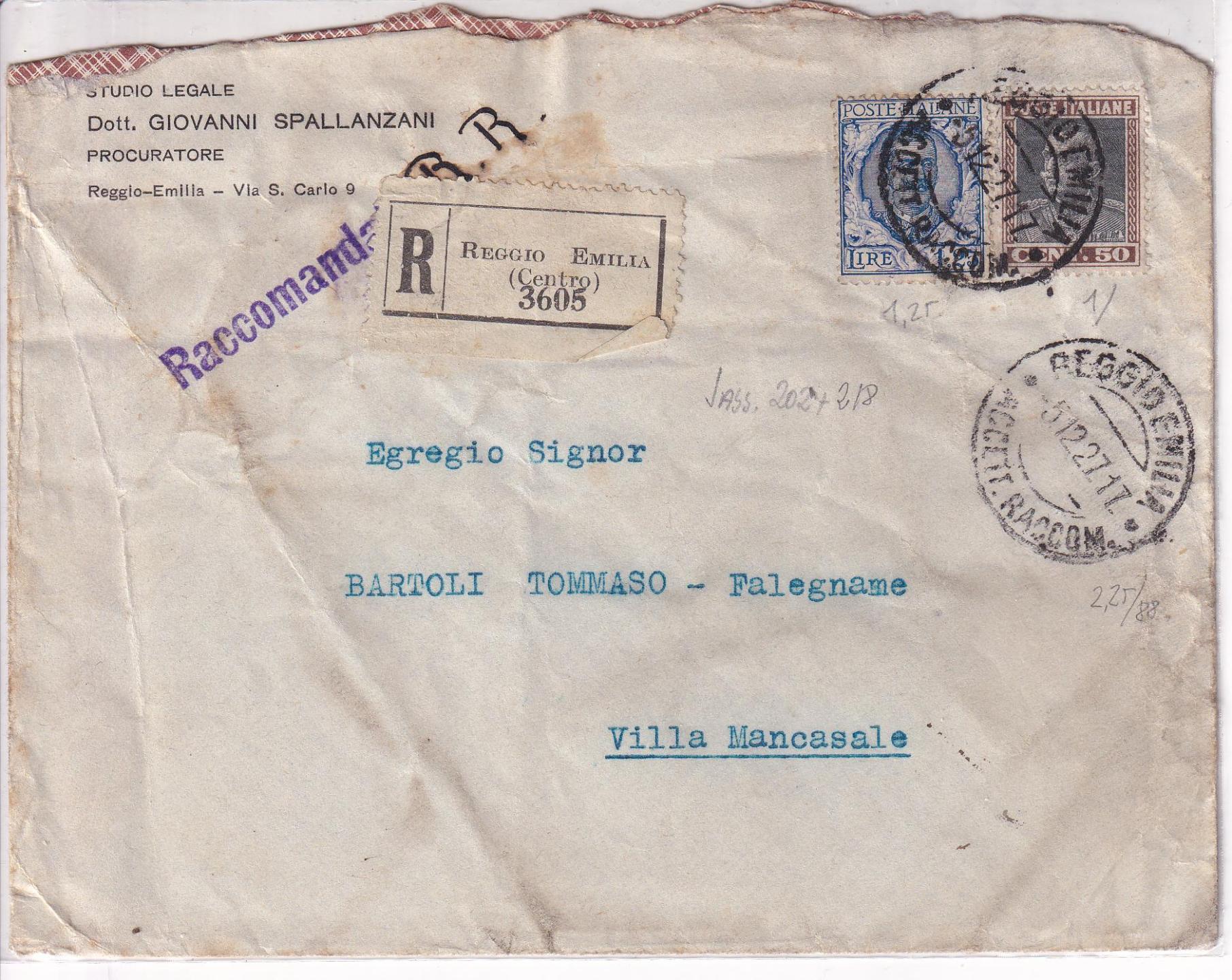 Raccomandata R. R. da Reggio Emilia 3605 del 05/12/1927 Villa Mancasale 27/02/1928