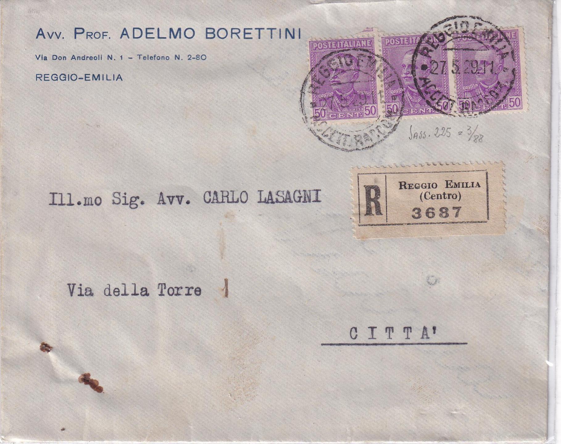 Storia postale. Raccomandata Reggio Emilia 3687 del 27/05/1929 a Reggio Emilia 27/05/1929