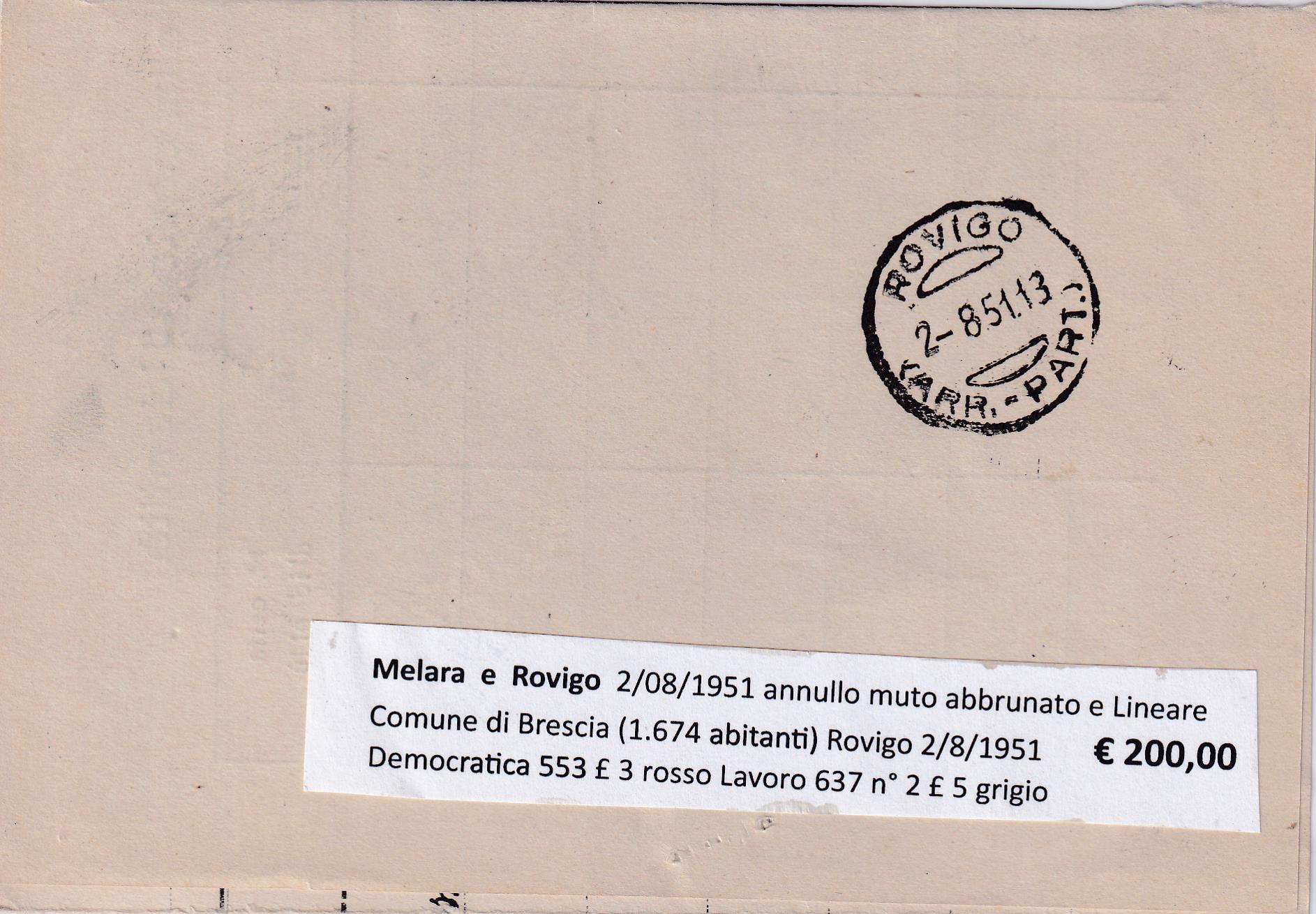 Annullo muto Melara e Rovigo – Data 2/08/1951 Francobolli Democratica (cat. n. 553) Lire 3 rosso e Italia al Lavoro (cat. n. 637) Lire 5 grigio