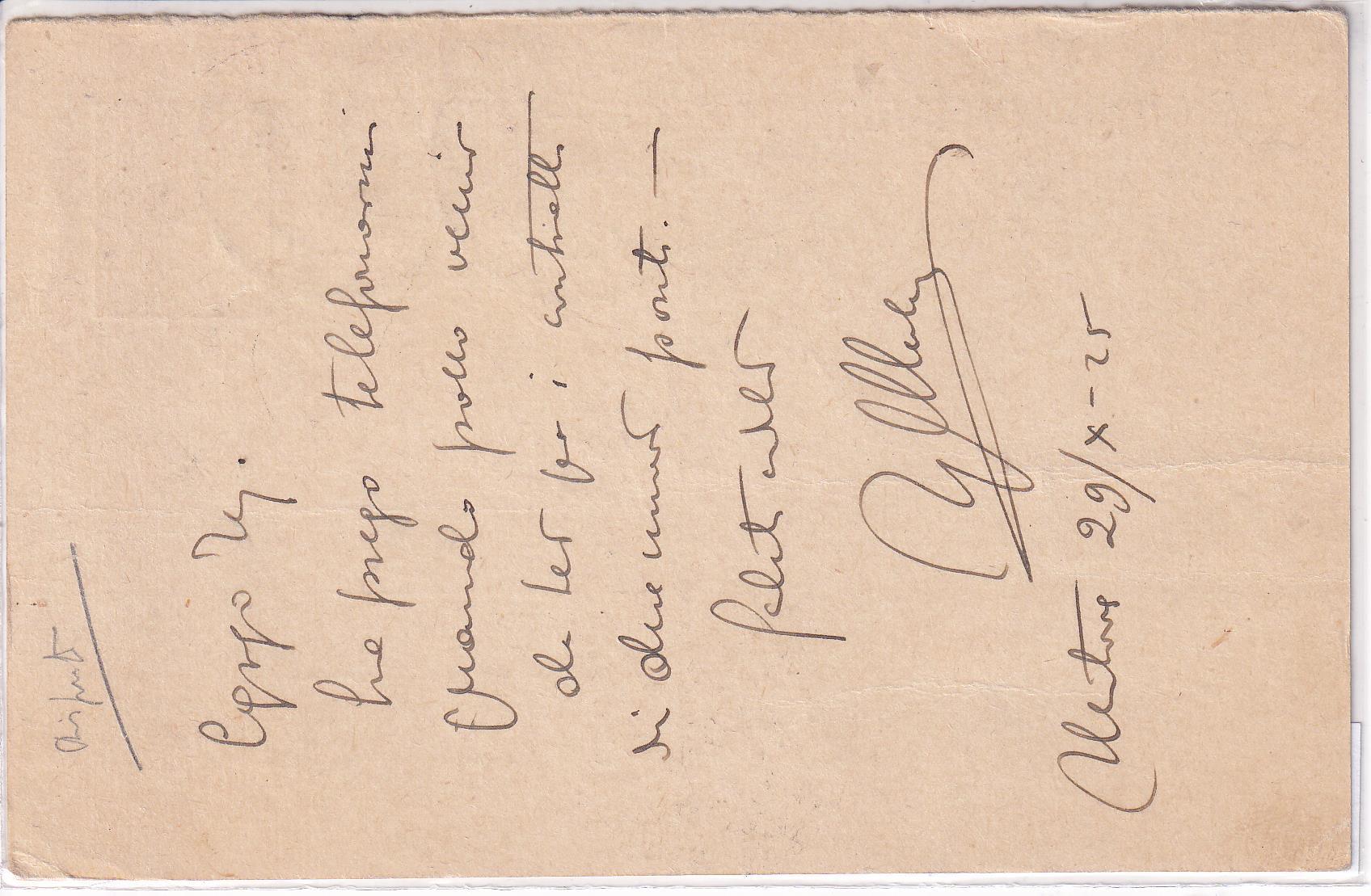 Storia postale. Biglietto postale da Bergamo 29/08/1925 a Reggio Emilia 30/08/1925