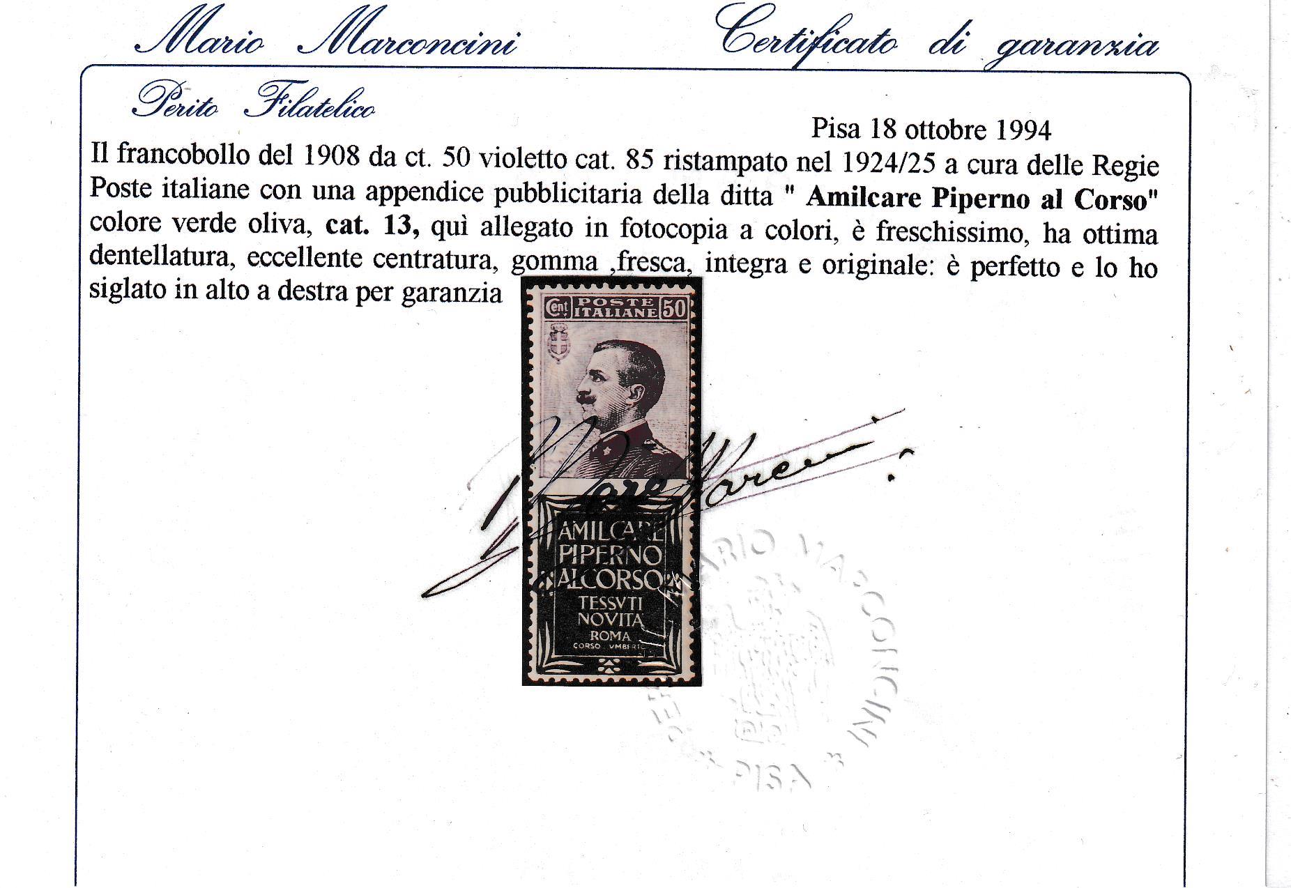Francobollo Regno d’Italia – Pubblicitari Amilcare Piperno al Corso Anno 1924 Centesimi 50 violetto e verde (cat. n. PU13) con Certificato