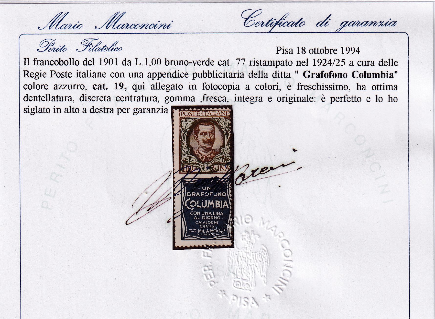 Francobollo Regno d’Italia – Pubblicitari Columbia Anno 1924 Lire 1 bruno verde azzurro (cat. n. PU19)